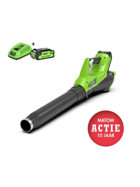 Wilt u het materiaal na het wegblazen opzuigen dan plaatst u bij de Greenworks GD40BV serie een aanzuigbuis met opvangzak. Het materiaal wordt opgezogen en door een hakselmes verkleint waardoor u tot 10 x meer materiaal kunt opzuigen voordat u de zak moet legen. Het voordeel van Greenworks is dat u de machines ook zonder accu kunt aanschaffen want alle accu’s (zowel 2.0 Ah als 4.0 Ah) zijn natuurlijk onderling uitwisselbaar op de gehele 40 volt lijn. Uiteraard zal de lijn de komende jaren verder worden uitgebreid.